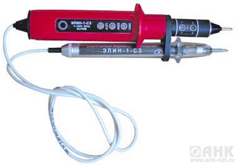 Предназначены для определения наличия или отсутствия напряжения в эл. установках постоянного и переменного тока от 12 до 400 В. Указатель напряжения ЭЛИН — 1СЗ Является двухполюсным указателем напряжения и прндназначен для определения наличия или отсутствия напряжения контактным способом с указанием полярности в диапозоне напряжений от 12 до 400В. Не имеет встроенного источника питания. Устройство позволяет определить фазу и примерно оценить величину контролируемого напряжения.